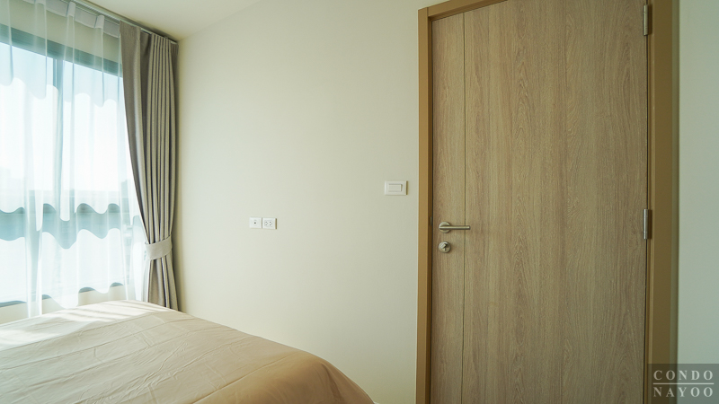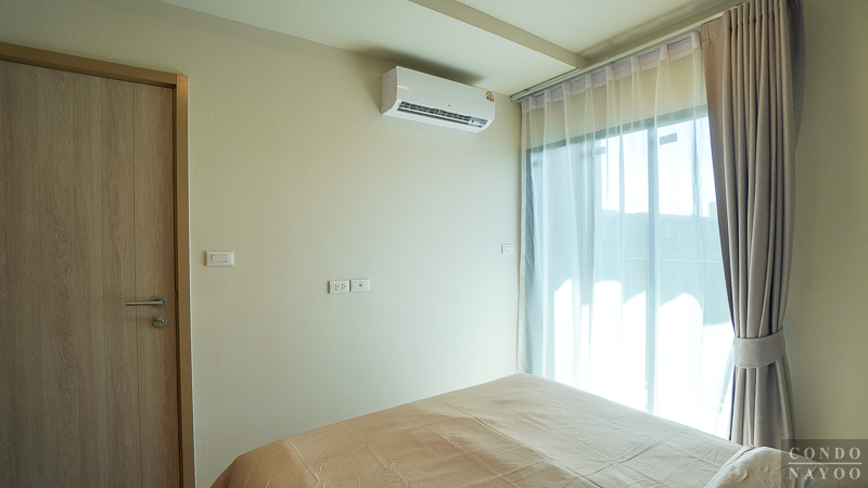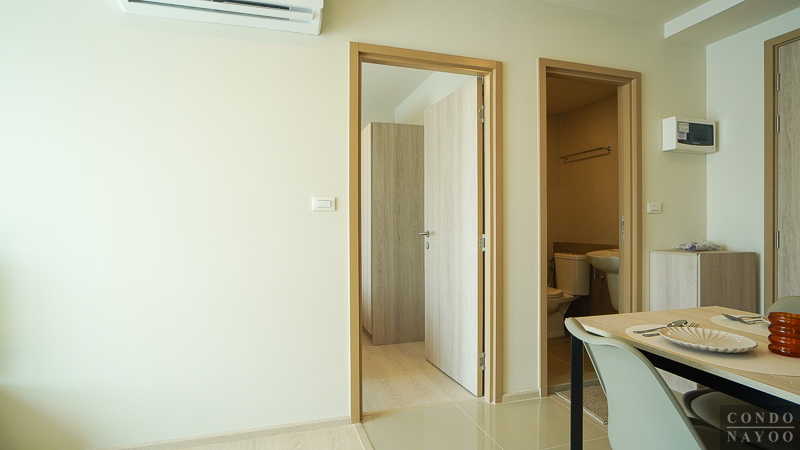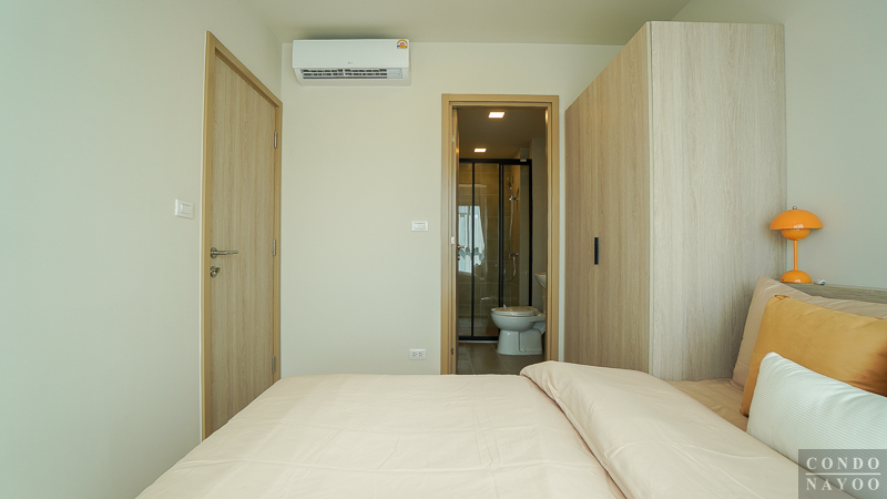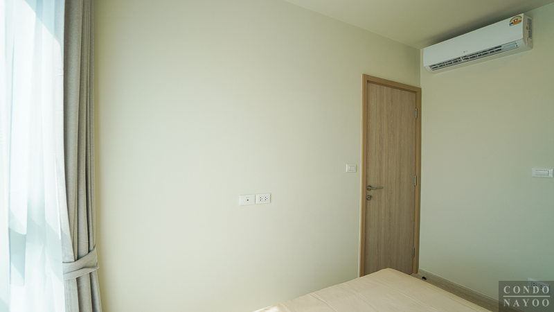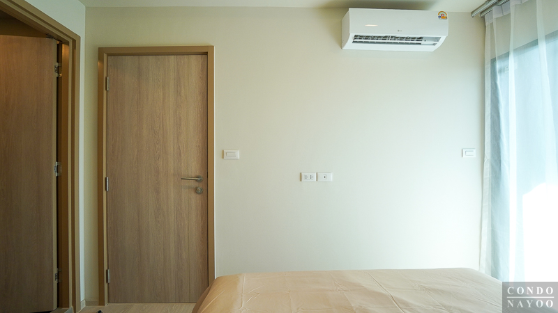 มองกลับมาอีกฝั่ง จะเป็นที่วางตู้เสื้อผ้า ทางเข้าห้องน้ำ และผนังข้าง ๆ จะติดแอร์มาให้ 1 เครื่อง โดยผนังตรงส่วนที่โล่ง ๆ เราสวามารถซื้อกระจกเงาบานใหญ่มาติดเพิ่มเองได้นะคะ