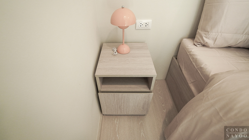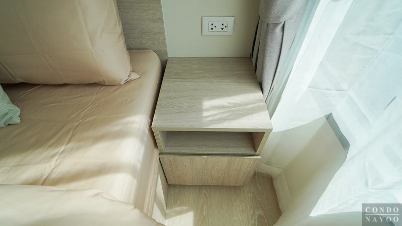 ข้างเตียงด้านในได้โต๊ะลิ้นชักหัวเตียงมา 1 ตัว ด้านหลังมีปลั๊กไฟติดมาให้ สามารถเสียบชาร์จแบตมือถือ หรือต่อใช้ Gadget อื่น ๆ ได้สะดวก