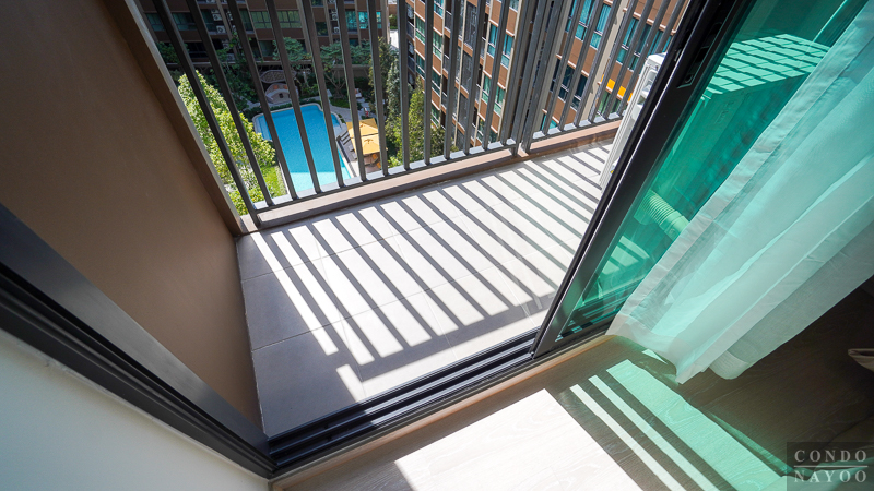 ด้านนอกจะเป็นระเบียงส่วนตัว ตรงนี้จะกั้นแยกห้องไว้ด้วยประตูกระจกบานเลื่อน 3 ตอน เลื่อนเปิดได้จนสุด และทำให้เดินเข้า-ออกใช้งานได้สะดวกมากขึ้น