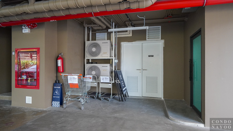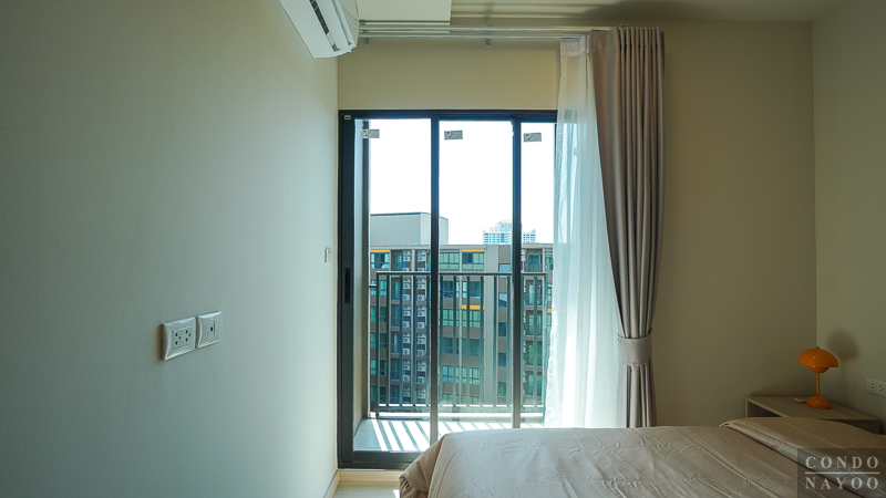 ประตูระเบียงเป็นกระจกบานเลื่อน 3 ตอน กรอบอะลูมิเนียมสีดำ มีการยกธรณีกันน้ำ กันฝุ่นไว้ให้ และด้านนอกจะติดราวกันตกมาให้ ส่วนผนังด้านบนจะเป็นที่ตั้งของ CDU แบบแขวนปล่อยลมร้อนออกไปด้านนอกอาคาร