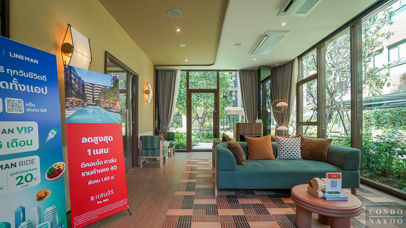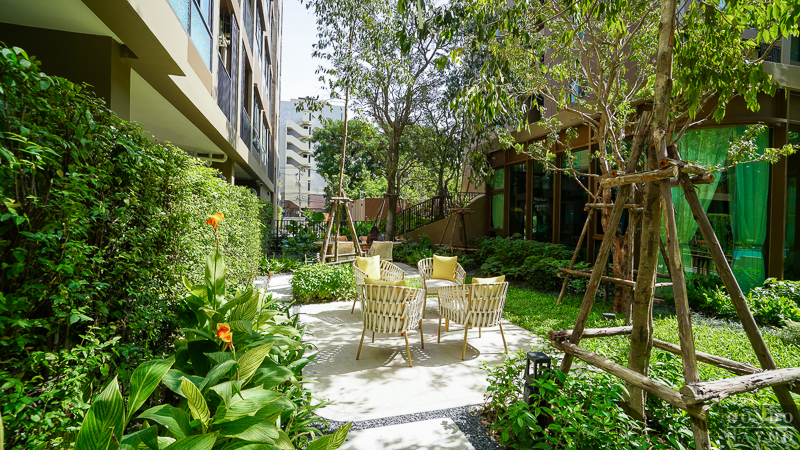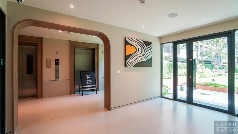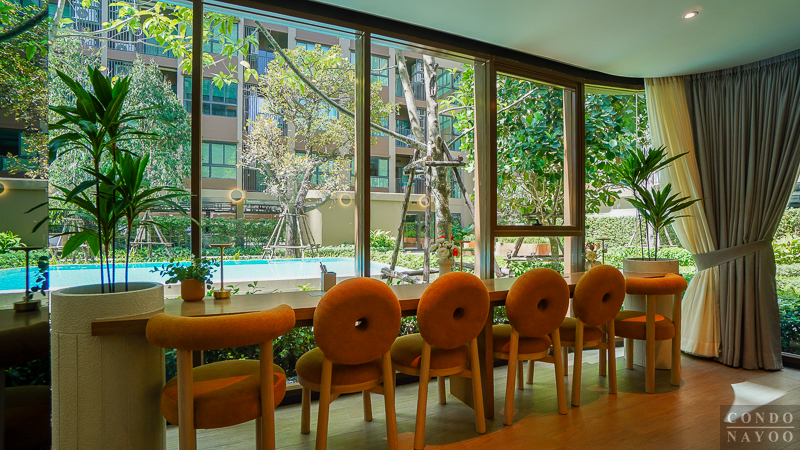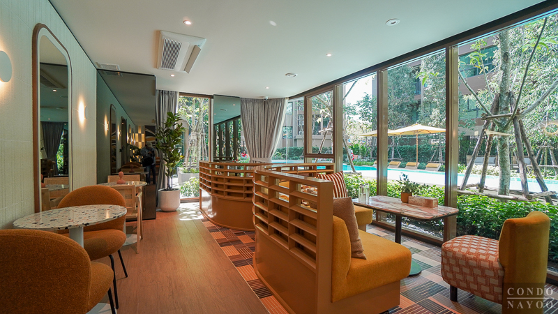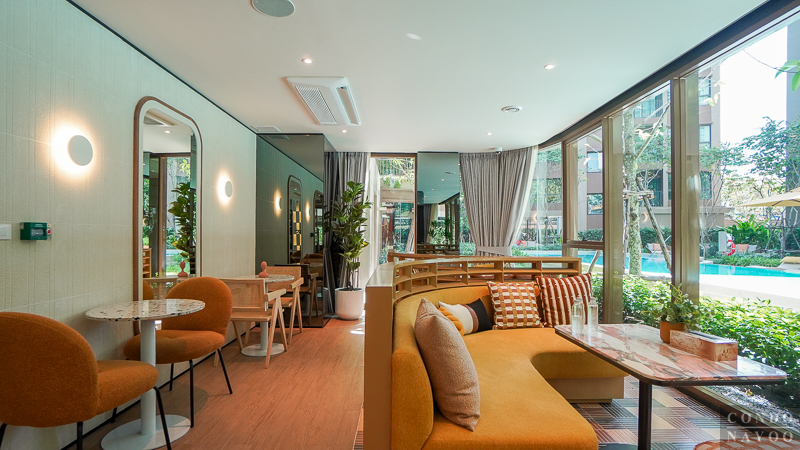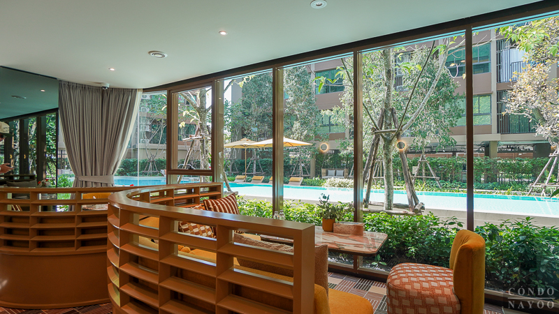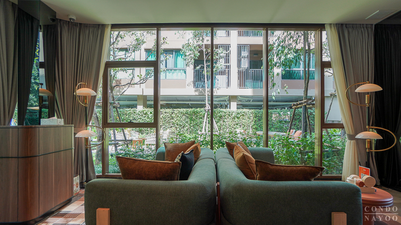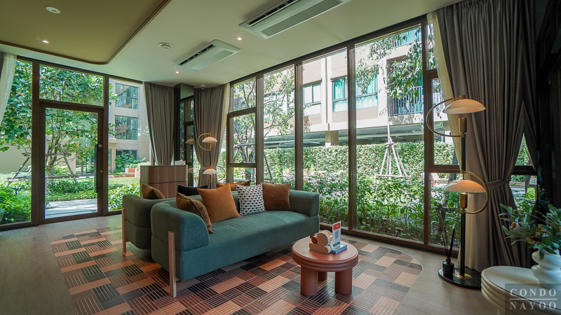 Main Facilities จะอยู่ที่ชั้น 1 ได้แก่ Lobby ที่มองเห็นวิวสวน, Co-working Lounge ที่มีหลายมุมให้เลือกใช้งาน และ Panoramic Gym ห้องฟิตเนสผนังกระจกที่มองเห็นวิวสวนแบบเต็มตา
