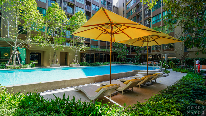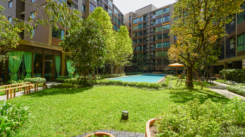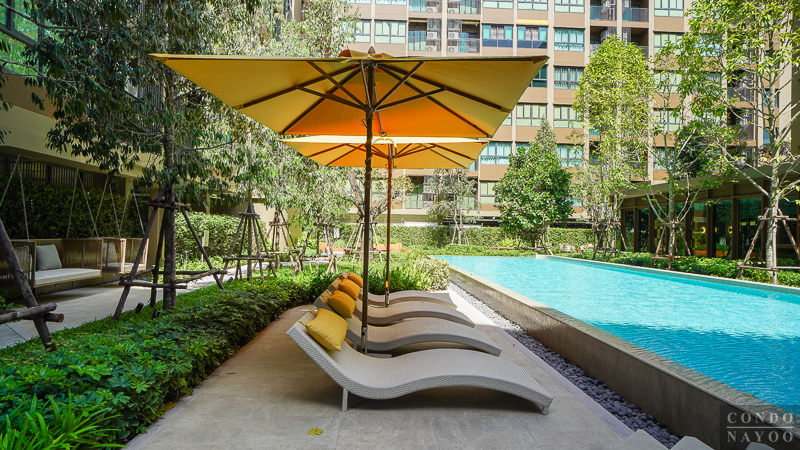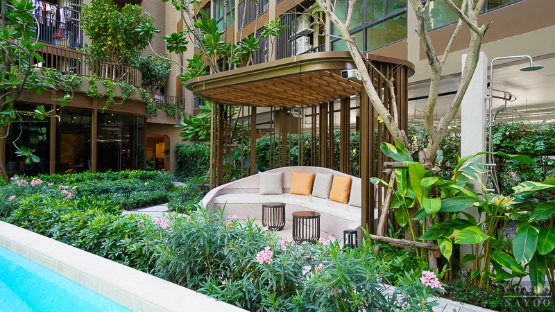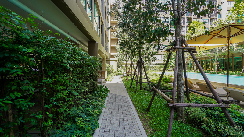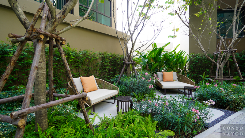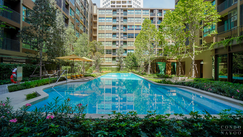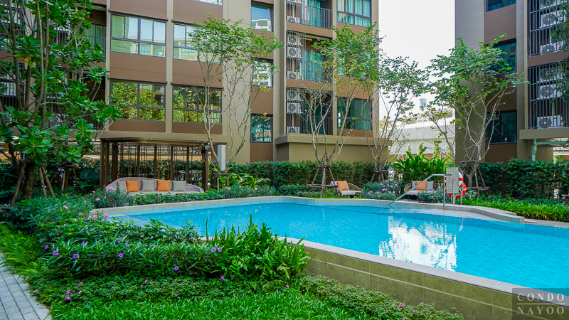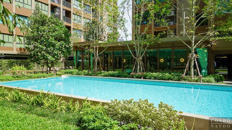 ในด้านส่วนกลางก็จัดเต็มบนพื้นที่กว่า 1 ไร่* ไฮไลต์คือสวนขนาดใหญ่ใจกลางโครงการ และ Relaxing Pool แบบ Half-Olympic ที่วางตัวระหว่างสองอาคารเหมือนโอเอซิสกลางคอนโด พร้อม Sansiri Backyard และมุมพักผ่อนกระจายรอบสวน รวมถึงทางเดินร่มรื่นสำหรับเดินเล่นหรือวิ่งเบา ๆ