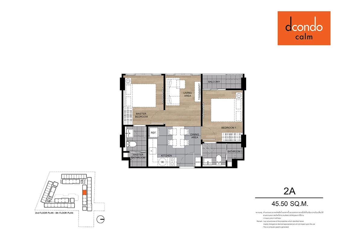 แปลนห้องตัวอย่าง 2A ขนาด 45.50 ตร.ม. เป็นแบบ 2 ห้องนอน 2 ห้องน้ำ และเป็นยูนิตที่ใหญ่ที่สุดของโครงการ ออกแบบให้เป็นห้องหน้ากว้าง ทำให้บรรยากาศการอยู่อาศัยโปร่งสบายเหมือนอยู่บ้าน ฟังก์ชันภายในจัดวางอย่างลงตัวตั้งแต่โถงกลางห้อง