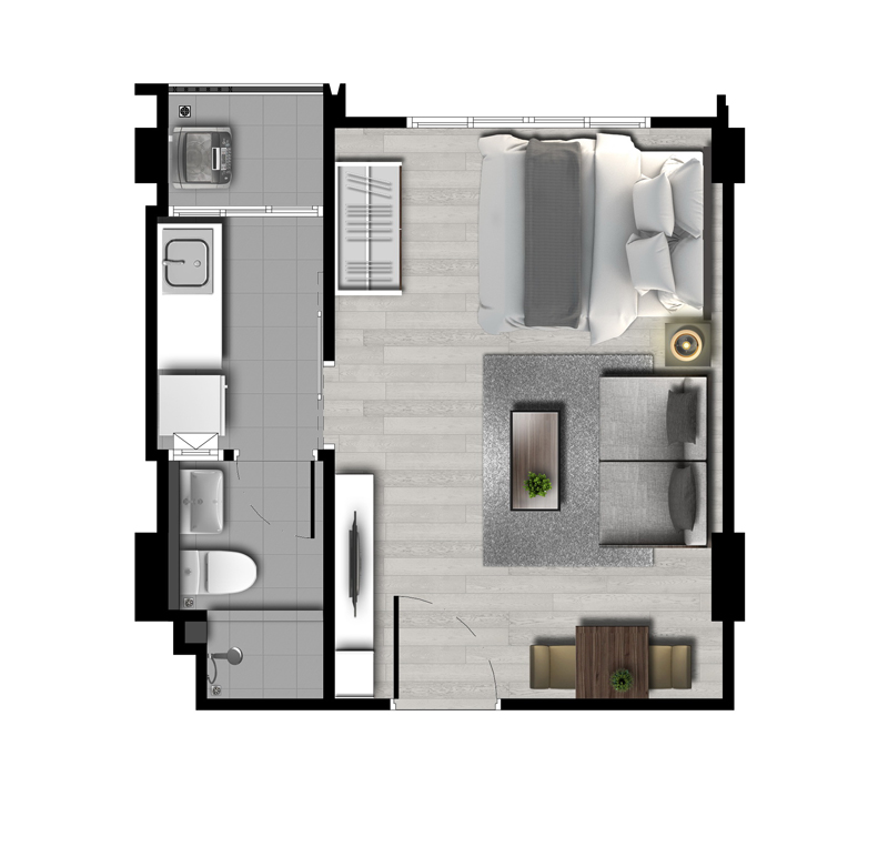 จากหน้าห้องมองเข้าไปจะเห็นได้เลยว่าพื้นที่ห้องกว้าง เนื่องจากเป็นห้องหน้ากว้าง และยังเป็นห้องแบบสตูดิโอที่เชื่อมพื้นที่ระหว่างห้องนั่งเล่นและห้องนอนรวมกัน ริมเตียงนอนมีหน้าต่างกระจกบานใหญ่ทำให้มีแสงธรรมชาติส่องเข้ามาในห้องพื้นที่จึงยิ่งดูกว้าง