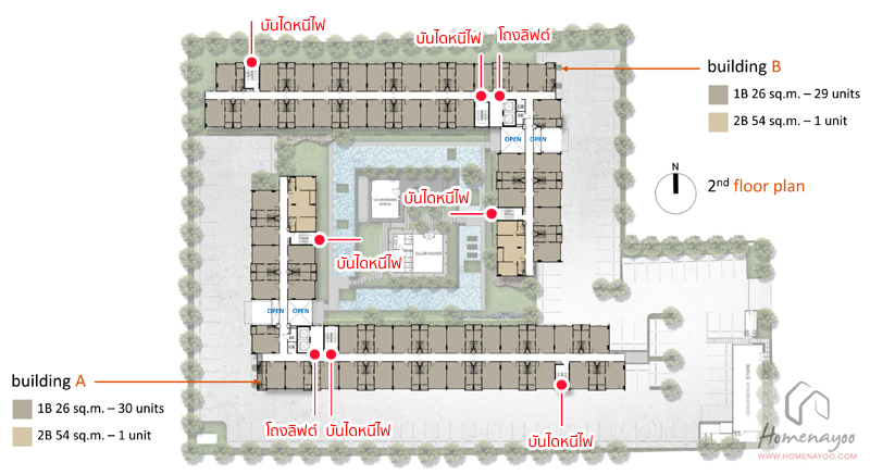 ผังอาคารชั้น 2 เป็นชั้นพักอาศัยทั้งหมด โดยห้องแบบ 2 ห้องนอนจะมีเพียงชั้นละ 1 ห้องต่อ 1 อาคารเท่านั้น ซึ่งเป็นห้องที่ได้วิวสวยๆจากพื้นที่ส่วนกลางด้านในโครงการค่ะ