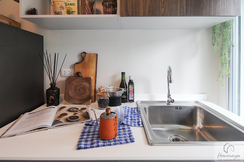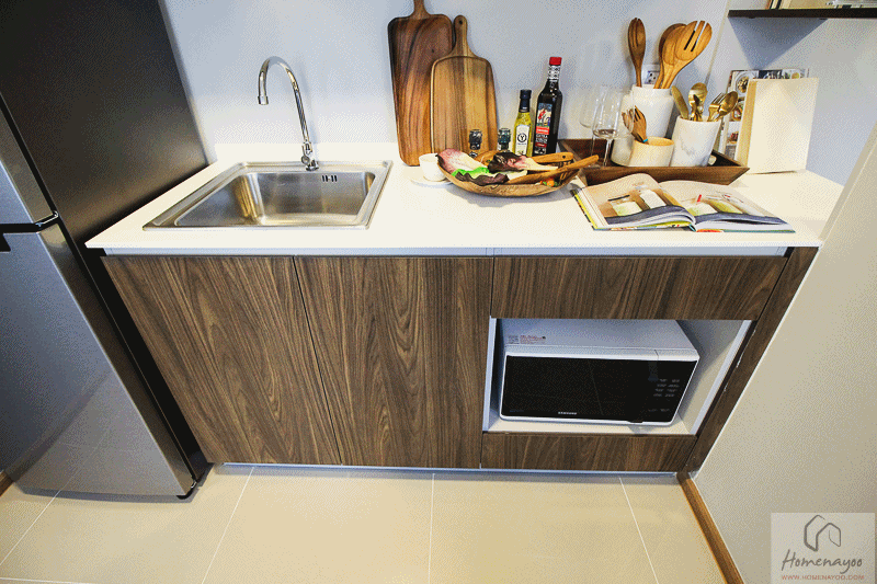 เคาน์เตอร์ครัวเมื่อวางอ่างล้างจานก็จะเหลือพื้นที่สำหรับวางเตาไฟฟ้าและเตรียมอาหาร