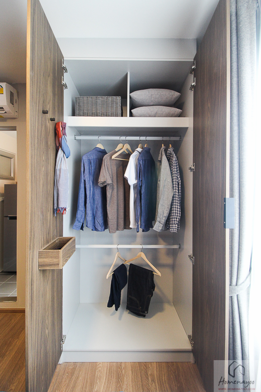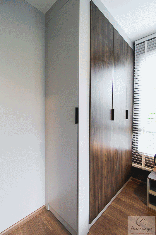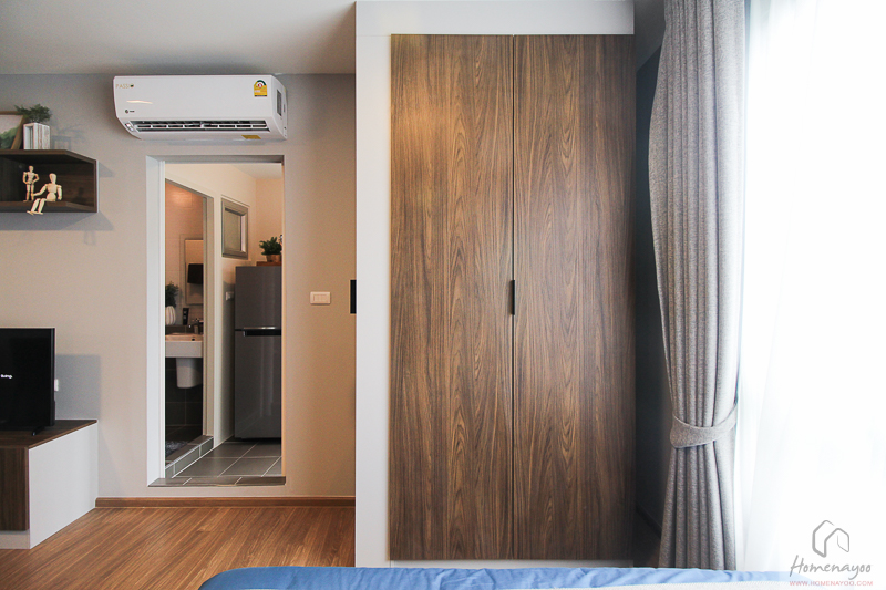 ปลายเตียงเป็นมุมแต่งตัวมีตู้เสื้อผ้าใบใหญ่ หน้าบานเป็นลามิเนตลายไม้