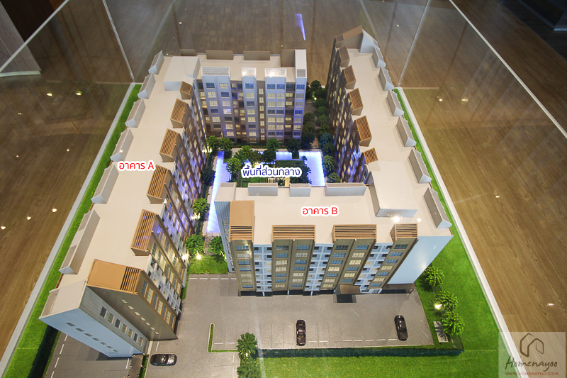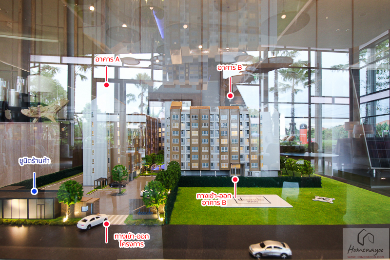 โมเดลโครงการ ด้านนี้เป็นด้านหน้าโครงการจะเห็นทางเข้า-ออกที่อยู่ติดกับถนนใหญ่และยูนิตร้านค้า ด้านในเป็นทางเดินรถที่ตรงเข้าไปในตัวโครงการ อาคารทั้งสองจะวางล้อมพื้นที่ส่วนกลางไว้ ด้านนี้หันหน้าไปทางทิศตะวันออกค่ะ