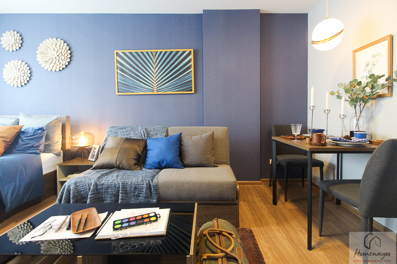 เข้ามาในห้องส่วนแรกคือห้องนั่งเล่นและมุมทานอาหาร มุมนี้ทางโครงการมีโซฟาเบด, โต๊ะกาแฟ, โต๊ะทานอาหารพร้อมเก้าอี้ 2 ตัวให้นะคะ