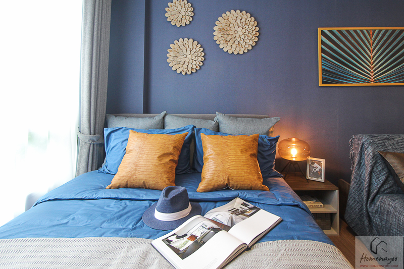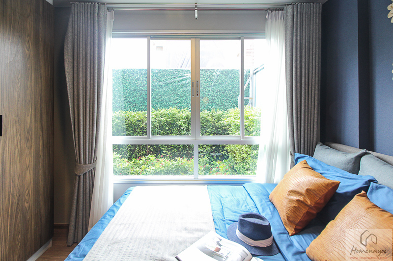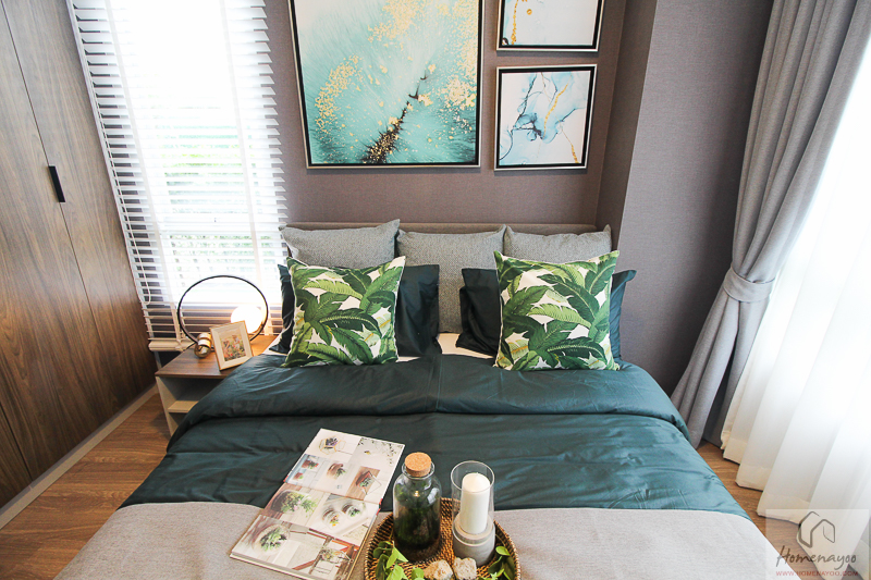 ถัดไปเป็นส่วนห้องนอน ตรงนี้อยู่ติดกับหน้าต่างกระจกบานใหญ่จึงดูสว่างและโปร่ง โครงการจะให้ฐานเตียง, โต๊ะหัวเตียงและตู้เสื้อผ้าตามที่เห็นในห้องตัวอย่าง