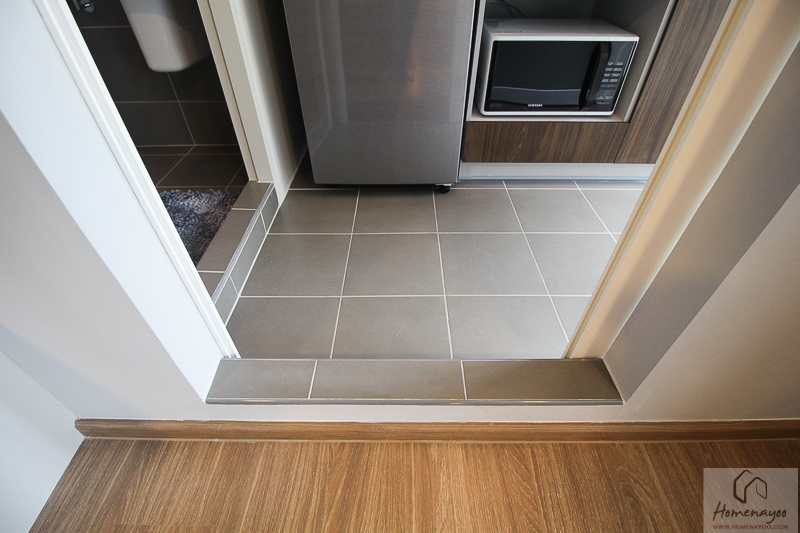 พื้นเป็นกระเบื้องเซรามิคขนาด 30×30 ซม.แบบเดียวกัน ธรณีประตูยกสูงเพื่อกันน้ำจากภายนอก