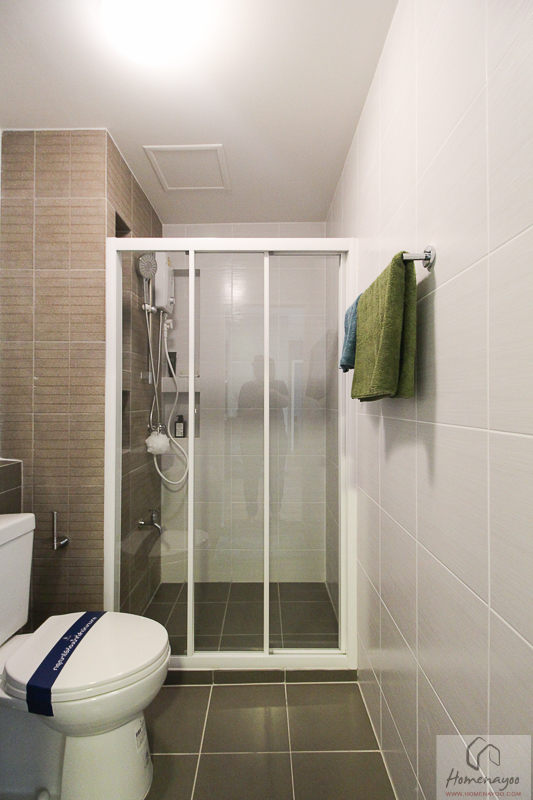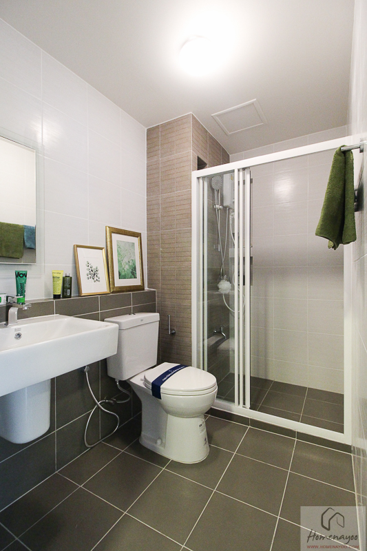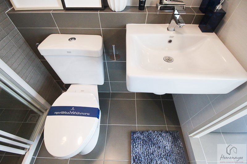 ภายในเป็นโทนสีเทา-ขาว แยกโซนแห้งและเปียกชัดเจนด้วยฉากกั้นอาบน้ำที่ทางโครงการมีให้
