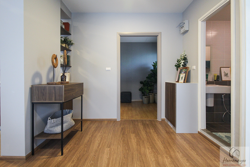 หันกลับมายังส่วนหน้าห้องเป็นมุมตู้เก็บของ ตู้เก็บรองเท้าและห้องน้ำ เป็นพื้นที่ต้อนรับหน้าบ้านเมื่อเข้ามาก็สามารถวางของ หรือก่อนออกบ้านก็หยิบจับของต่างๆเช่นร่มหรือกุญแจบ้านได้สะดวก