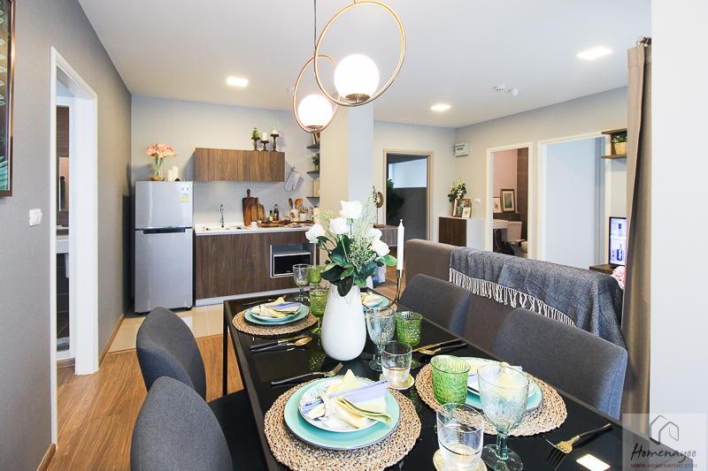 โต๊ะทานอาหารสามารถวางสำหรับ 2 ที่นั่งได้ พื้นที่ใช้สอยกว้างให้เดินผ่านระหว่างโต๊ะกับโซฟาเพื่อเข้าไปนั่งได้ง่าย