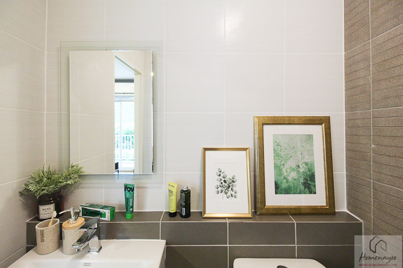 ด้านบนมีกระจกเงาและผนังเตี้ยทำให้วางของเพิ่มได้อีกเยอะ