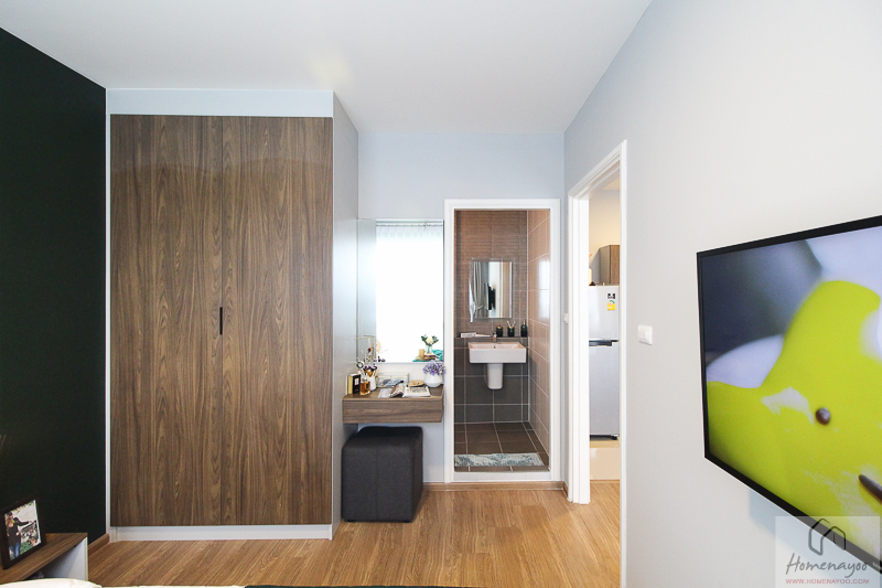 อีกด้านเป็นมุมแต่งตัวและห้องน้ำมีตู้เสื้อผ้าใบใหญ่ หน้าบานเป็นลามิเนตลายไม้ ด้านข้างตู้เสื้อผ้ามีโต๊ะเครื่องแป้งพร้อมกระจกเงาบานใหญ่