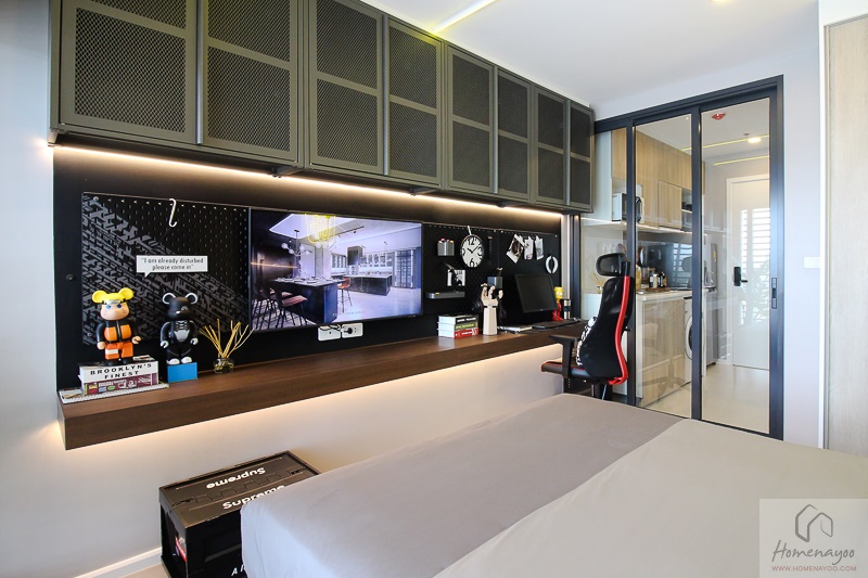 ในส่วนของฝั่งปลายเตียง เราจะได้ชั้นวางทีวีและโต๊ะทำงาน ใช้นั่งทำงาน, ใช้เป็นโต๊ะเครื่องแป้ง และใช้เป็นโต๊ะนั่งรับประทานอาหารได้ในตัว เราจะทำ Built-in พวกตู้ลอยสำหรับเก็บของเพิ่มเติมก็ยังได้