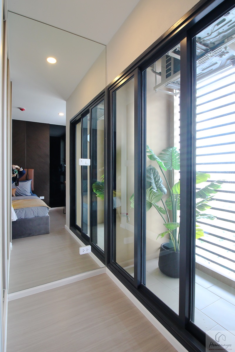 ทางฝั่งขวานี้เป็นประตูบานเลื่อนเชื่อมกับระเบียงห้อง เป็นพื้นที่สำหรับการซักล้าง ตากผ้า และพักผ่อนรับลม ที่ชอบก็คือ ทางโครงการมีการออกแบบ Facade มาเป็นระแนงเพื่อช่วยบังสายตาและบังแสง ทำให้แสงไม่จ้าจนเกินไป และได้ความเป็นส่วนตัวเพิ่มขึ้น
