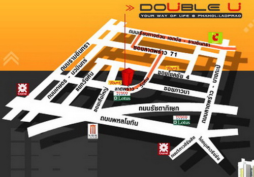 การเดินทาง เริ่มจาก ถนนลาดพร้าว > แยกโชคชัย 4 > ถนนโชคชัย 4 > ถนนลาดพร้าววังหิน > Double U Condominium พหล – ลาดพร้าว *ใกล้ซอยลาดพร้าววังหิน 46
