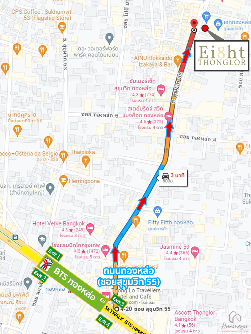 การเดินทาง BTS ทองหล่อ ⇒ แยกทองหล่อ ⇒ ถนนทองหล่อ (ซอยสุขุมวิท 55) ⇒ ถึงโครงการ Eight Thonglor Residences *BTS ทองหล่อ เพียง 800 เมตร หรือ ประมาณ 3 นาที*