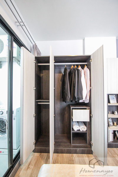 ส่วนปลายเตียงวางตู้เสื้อผ้า ถ้าจะดูทีวีสามารถดูได้เลยทางขวามือ อาจจะติดตัวยึดผนังที่บังคับทีวีหันซ้ายขวาได้