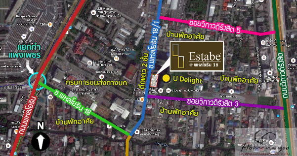 ทำเลที่ตั้งโครงการ – Estabe พหลโยธิน 18 ตั้งอยู่ในทำเลไม่ไกลจากสวนจตุจักรที่เป็นทั้งแหล่งช็อปปิ้ง และจุดเชื่อมต่อการเดินทางไปยังที่ต่างๆ โดยทางเข้า-ออกโครงการมีหลายเส้นทาง ที่สามารถเชื่อมกับซอยพหลโยธิน 18/1 ได้ รอบๆโครงการระยะเดินในซอยมีร้านอาหารริมทางให้เห็น 7-11 ห่างจากโครงการประมาณ 70 ม. แต่ส่วนใหญ่ในซอยนี้จะเป็นร้านตรวจสภาพรถ ตรอ. ร้านต่อทะเบียนรถ เนื่องจากพื้นที่อยู่ติดกับกรมขนส่งทางบก ตลาดสดใกล้ๆมี อ.ต.ก. และตรงเส้นสุทธิสารวินิจฉัย ตามริมทางถนนพหลโยธินก็มีของขายจะเป็นพวกร้านรถเข็น เสาร์อาทิตย์ก็จะมีตลาดนัดจตุจักรมีทั้งของกิน ของใช้ และอีกหลายอย่างครับย่านนี้หาของกินไม่ยากเท่าไหร่ แต่ถ้าคนชอบห้างสรรพสินค้าก็คงต้องไปเซ็นทรัลลาดพร้าวเลย ตรงข้ามเซ็นทรัลก็เป็นยูเนี่ยนมอลล์ หรือมาตรง Big C สะพานควาย นอกนั้นก็ขึ้นรถไฟฟ้าเข้าไปในเมืองสะดวกดีครับ