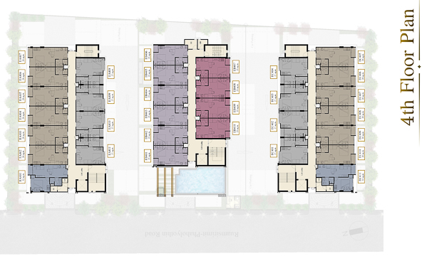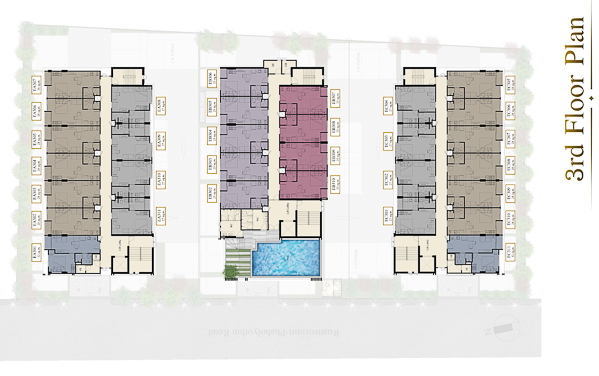 การออกแบบโครงการและวัสดุ – ตัวโครงการออกแบบมาบนเนื้อที่ดินขนาด 643 ตร.วา ตัวอาคารรูปทรงสี่เหลี่ยมผืนผ้าวางแนวยาวเรียงกัน 3 อาคาร สูง 8 ชั้น โดยหันข้างอาคารออกด้านหน้าและด้านหลัง ตัวอาคารใช้โทนสีเทาเข้ม และตัดด้วยเหลืองทอง แปลนห้องมีแบบ Studio และ 1 Bedroom ห้องพักอาศัยเริ่มที่ชั้น 2-8 จัดส่วนกลางไว้ที่อาคาร B ที่ชั้น 2-3 ส่วนที่จอดรถอยู่ชั้น 1 ทั้งหมด
