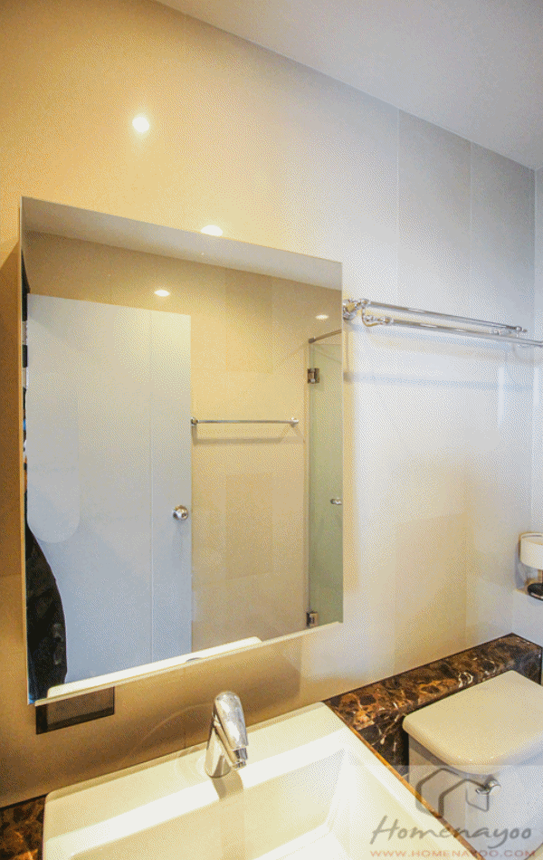 ตู้กระจกตรงอ่างล้างหน้าเป็นบานเปิดออก แบ่งชั้นวางของด้านใน