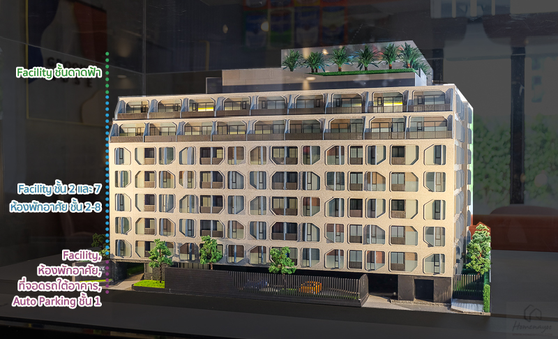 สิ่งอำนวยความสะดวก – Facility ของโครงการออกแบบมาได้หลากหลายน่าใช้งาน และ เปิดให้ลูกบ้านใช้งานได้ 24 ชม. โดยจัดไว้ตรงกลางของอาคาร ส่วนกลางจะอยู่ที่ชั้น 1, 2, 7 และดาดฟ้า โดยที่ชั้น 1 จะมี Lobby , Mail Box , Smart Locker , Living Lounge , Theatre , Cafe ที่ชั้น 2 มี Working Pods & Library และ Meeting Room ที่ชั้น 7 จะมีห้องฟิตเนส และ Dance Studio ที่ชั้นดาดฟ้าจะมีสระว่ายน้ำระบบเกลือขนาด 15.10 x 3.20 ม. ริมสระมีพื้นที่นั่งพักผ่อน มีพื้นที่สำหรับ BBQ จัดปาร์ตี้เล็กๆได้