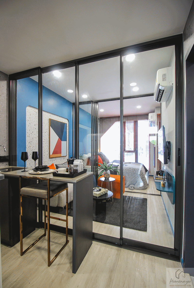 เดินเข้ามาแล้วมองกลับไปที่ประตูทางเข้า ฟังก์ชั่นโซนด้านหน้าคล้ายๆกับห้อง 1 Bed แต่จะมีพื้นที่มากกว่า