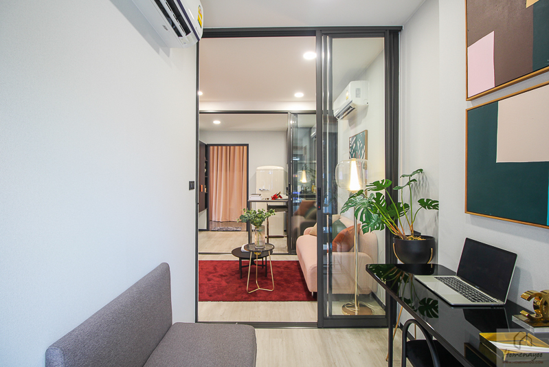 เดินเข้าห้องมาจะเจอส่วนครัวก่อน ขวามือเป็นห้องน้ำ ด้านในจะเป็นห้องนั่งเล่น ห้องอเนกประสงค์และห้องนอน พื้นห้องเป็นสมาร์ทไวนิล ผนังจะได้ฉาบเรียบทาสีขาวทั้งห้อง ไฟได้แบบดาวน์ไลท์