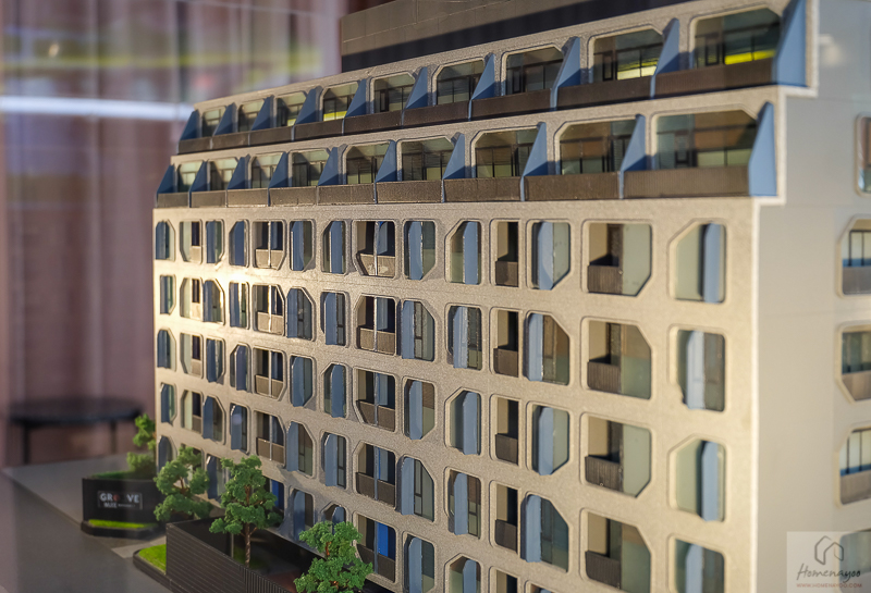 ตรงหน้าต่างและระเบียงแต่ละห้องจะมีความโค้งเว้า ดูมีลูกเล่นเป็นเอกลักษณ์ที่โดดเด่นไม่เหมือนอาคารทั่วๆไป