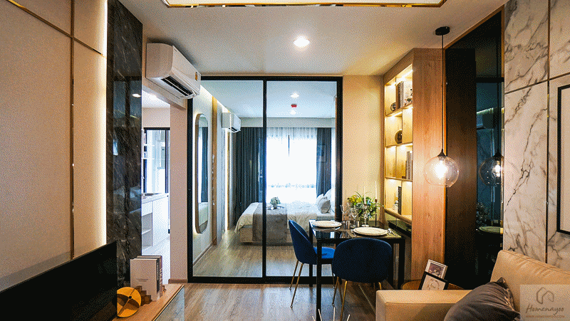 เดินเข้าห้องมาจะเจอส่วนห้องนั่งเล่นก่อน ใช้งานร่วมกับส่วนรับประทานอาหาร ถัดเข้าไปจะเป็นห้องนอนที่มีกระจกบานเลื่อนเป็นประตูกั้นแยกส่วน ภายในห้องนอนมีพื้นที่มาให้เยอะเช่นกันวางเฟอร์นิเจอร์ได้ครบ อีกโซนจะเป็นห้องน้ำ ห้องครัว และระเบียงที่จัดไว้โซนเดียวกัน การใช้งานแต่ละฟังก์ชันสะดวกเชื่อมต่อกัน