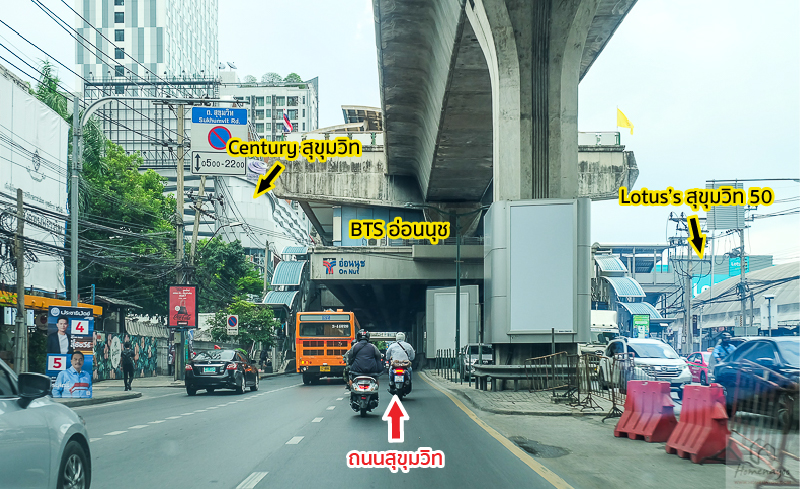 เร่ิมจากบนถนนสุขุมวิทตรงช่วง BTS อ่อนนุช มุ่งหน้าไปทางบางนา ซ้ายมือจะเป็น Century สุขุมวิท ขวามือเป็น Lotus’s สุขุมวิท 50