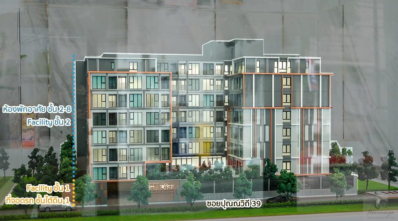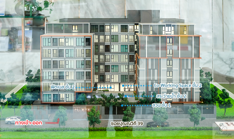 ทางเข้า-ออก ด้านหน้าโครงการติดกับซอยปุณณวิถี 39 Facility จะอยู่ฝั่งด้านหน้าทั้งหมด จะมีสวนที่ชั้น 1 และมีสระว่ายน้ำ, ฟิตเนส, Co-Working Space ที่ชั้น 2