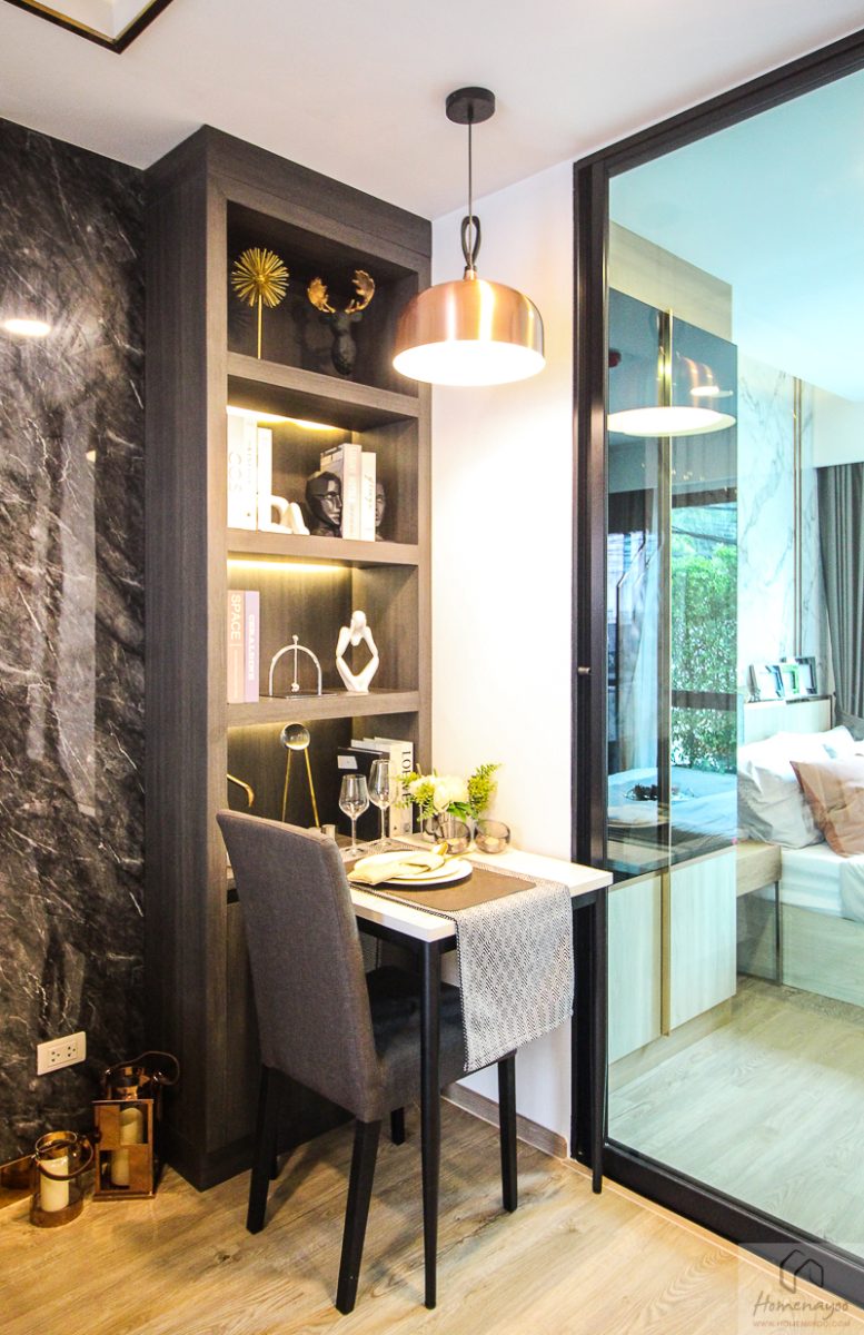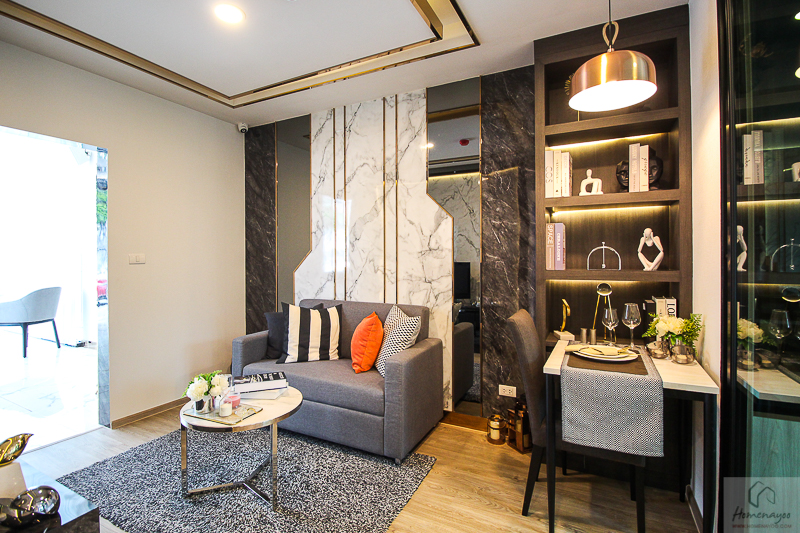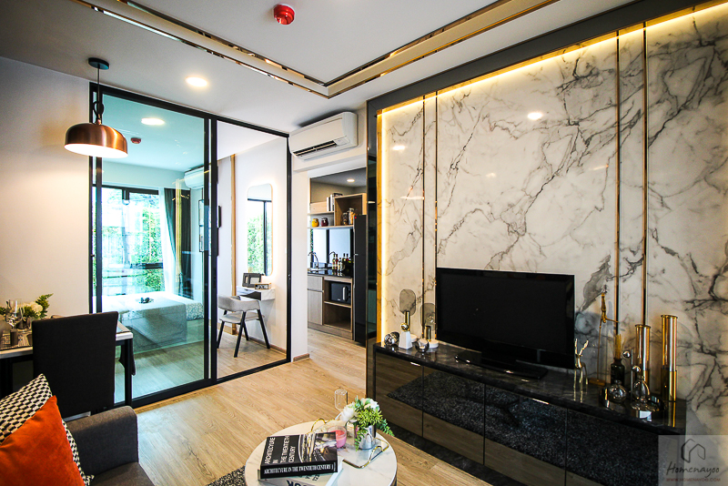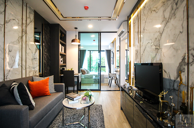 วันนี้เรามีห้องตัวอย่างมาให้ชม 1 แบบ เป็นห้อง 1 Bedroom ขนาด 28 ตร.ม. โดยโครงการขายแบบ Fully Furnished จะได้โซฟา ตู้วางทีวี ฐานเตียง ตู้เสื้อผ้า โต๊ะเครื่องแป้ง ชุดครัว แอร์ติดผนัง สุขภัณฑ์ในห้องน้ำ