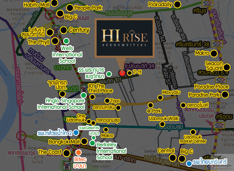 ทำเลที่ตั้งโครงการ โครงการ HI Rise สุขุมวิท 101 ตั้งอยู่ในทำเลชุมชนพักอาศัย โดยรอบโครงการส่วนใหญ่เป็นบ้านพักอาศัย ย่านนี้มีความอุดมสมบูรณ์พอสมควร ในระยะเดิน 100 ม. ตรงปากซอยปุณณวิถี 39 มี 7-11 ฝั่งตรงข้ามซอยมีร้านอาหาร