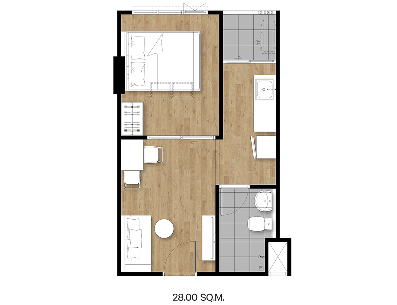 1 Bed ขนาด 28 ตร.ม. จุดเด่นของห้องนี้ ภายในห้องแบ่งฟังก์ชันการใช้งานเป็นสัดส่วน ห้องนั่งเล่นมีพื้นที่ให้เยอะ ห้องนอนพื้นที่วาง เตียง ตู้ โต๊ะเครื่องแป้งได้ครบ ประตูห้องนอนเป็นกระจกบานเลื่อน ข้อดีคือช่วยให้แสงส่องเข้ามาในห้องนั่งเล่นได้เยอะ ส่วนครัวแยกโซนไว้อยู่ติดระเบียง ช่วยให้ระบายกลิ่นได้ง่าย ห้องนำ้อยู่ติดกับครัวแบ่งส่วนเปียกส่วนแห้งมาให้