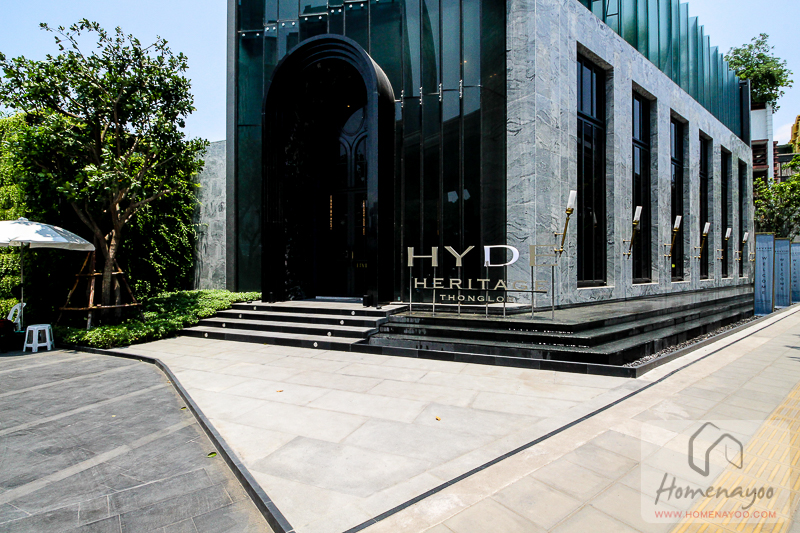 ด้านหน้าโครงการ HYDE Heritage ทองหล่อ ทางฝั่งทิศใต้อยู่ติดถนนใหญ่สุขุมวิทฝั่งขาออก อยู่ระหว่างโซนทองหล่อไปเอกมัย
