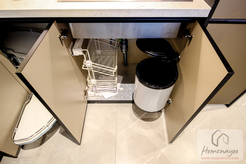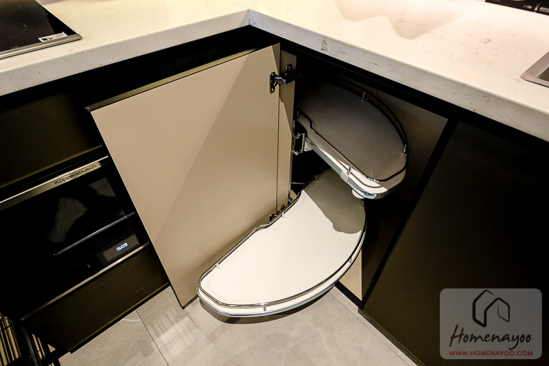 Top ครัวเป็นหินควอตซ์สีขาวขีดเทา โดยเป็นหินที่ให้สัมผัสที่เย็นเวลาจับค่ะ เข้ากันกับ Island และ Back Splash หรือผนังกันเปื้อนทำให้เช็ดล้างทำความสะอาดผนังหลังเคาน์เตอร์ได้ง่าย ชั้นวางของชั้นบนช่องนึงจะสามารถดึงชั้นลงมาได้ด้วย ทำให้เก็บหรือหยิบของเข้าออกได้ง่ายขึ้นแบบนี้