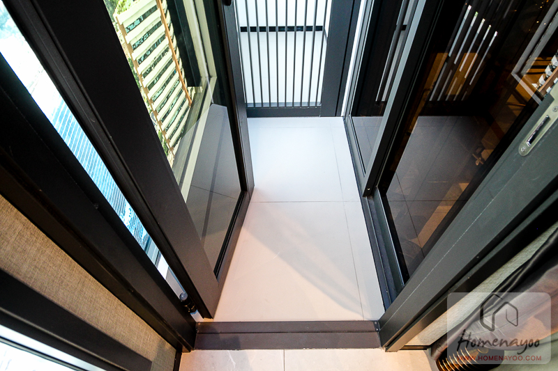 ที่ระเบียงจะมีประตูเปิดออกมาได้สองทาง ทั้งบานเปิดจากห้องนั่งเล่น และบานเลื่อนจากส่วนห้องทำงาน