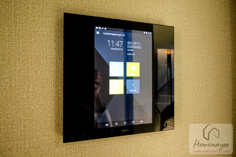 ผนังติดประตูทางเข้าห้องจะมีแผงระบบ Smart Home ของ zipato ซอฟต์แวร์ระบบอัตโนมัติภายในบ้านขั้นสูงสำหรับการควบคุมบ้านทั้งหมด เชื่อมต่อกับแอพมือถือและสามารถทำงานร่วมกับ Amazon Echo ขอให้ Alexa ควบคุมอุปกรณ์สมาร์ทโฮมที่คุณชื่นชอบด้วยมือถือและเสียงได้