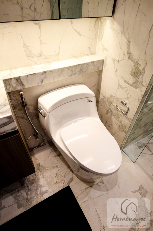 อ่างอาบน้ำของ TOTO เป็นอ่างทรงสี่เหลี่ยม ปกติห้อง 1 ห้องนอนโครงการทั่วไปจะไม่ค่อยมีอ่างอาบน้ำมาให้นะคะ แต่นี่มาแบบ Full option เลย มีชั้นวางของเลื่อนไปมาได้ให้มาด้วยค่ะ