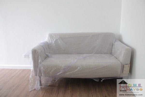 ฝั่งขวาเป็นโซฟา ขนาด 2 – 3 ที่นั่ง พร้อมโต๊ะวางกาแฟสีขาว ขนาด 60 xx 40 ซม.
