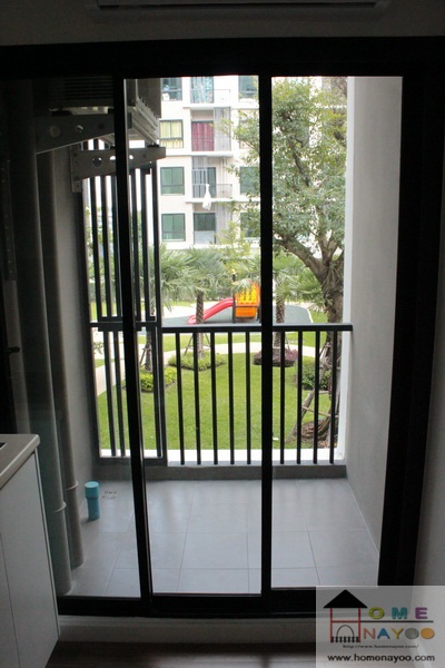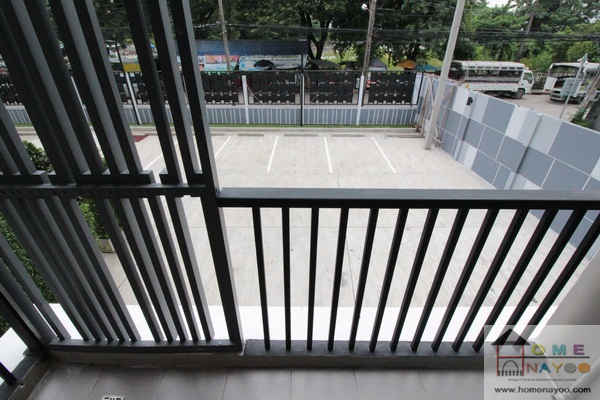 ออกจากห้องนอนเล็กมา เป็นระเบียง ประตูระเบียงเป็นกระจกบานสไลด์ 3 ตอน เหมือนกัน ขนาด 150 x 140 ซม.