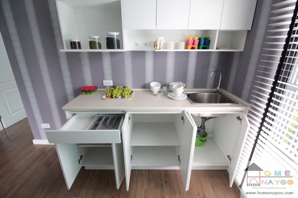 ถัดจากส่วน Living เข้ามา เป็นส่วนครัว พร้อมระเบียง