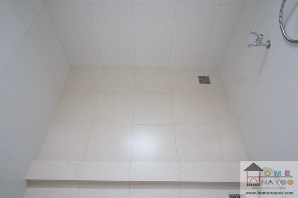 ห้องน้ำปูพื้นกระเบื้อง 30 x 30 ซม. แบ่งส่วนแห้งส่วนอาบน้ำชัดเจน