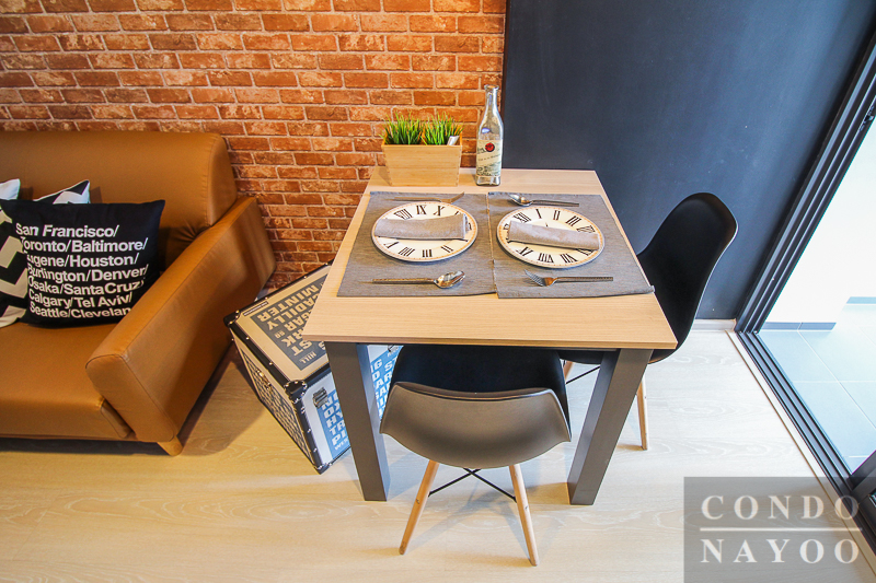 เดินเข้าห้องมาจะเจอส่วนห้องนั่งเล่น และส่วนรับประทานอาหาร ด้านในสุดเป็นห้องน้ำ และห้องครัว ส่วนฝั่งซ้ายจะเป็นห้องนอนทั้ง 2 ห้อง พื้นห้องเป็นลามิเนตหนา 8 มม. ฝ้าสูง 2.6 ม.