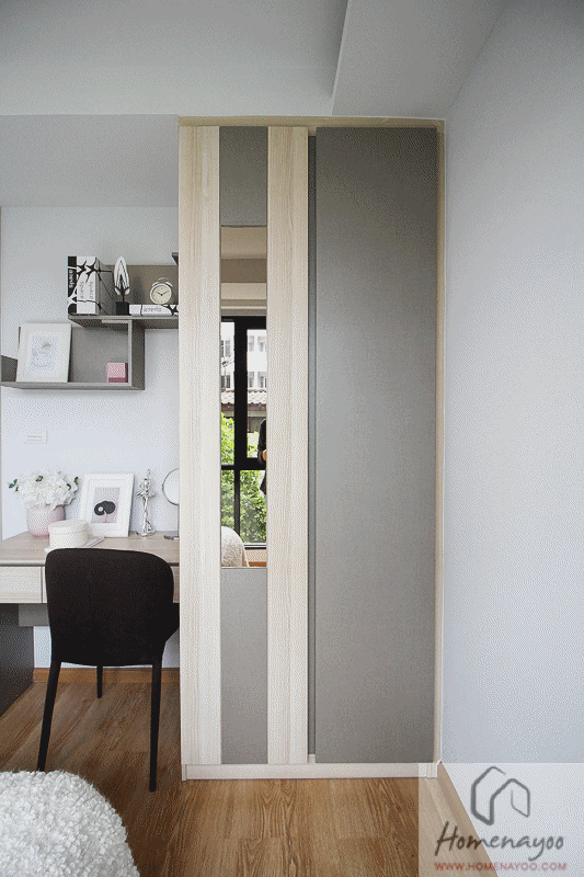 โดยตู้เสื้อผ้าที่ได้จะได้เป็นชุด Built – in ตู้บานเลื่อนแบบเปิดสลับ ด้านในมีราวแขวน, ลิ้นชัก, และชั้นเก็บผ้าปูที่นอนหรือผ้าเช็ดตัวด้านบน