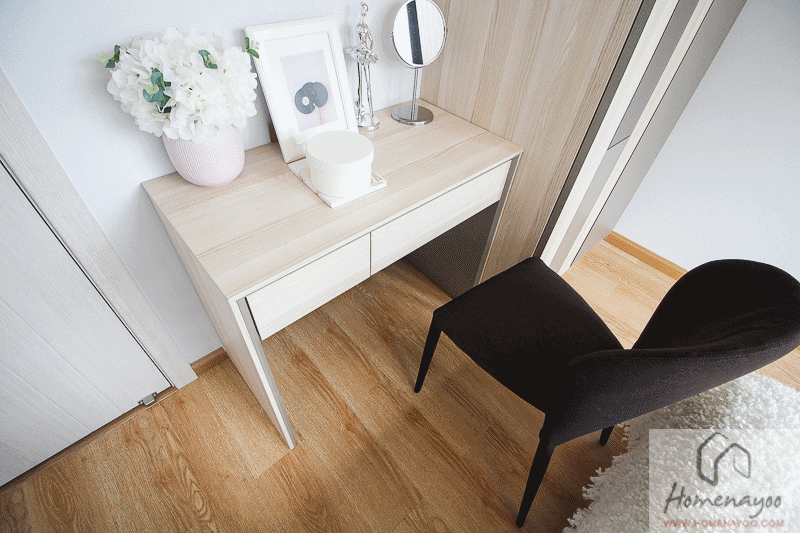 ติดกับตู้เสื้อผ้าเป็นโต๊ะเครื่องแป้ง ติดตั้งกระจกเงาพร้อมตู้เก็บเครื่องประดับด้านหลัง